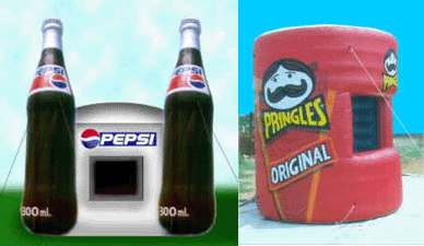 We can manufacture any shape or size cash machine, kiosk, inflatable tents & arches with your logos or product replica within the design. Think about how your logo or product can be incorporated into these designs. Portable, reusable, attention grabbers, malls, easy to setup, cold air inflatable... great for tradeshows, events, art festivals, sporting events, arenas, expo's and more. Comes with guarantee. Call toll free 1.866.666.1993 for more information and pricing.