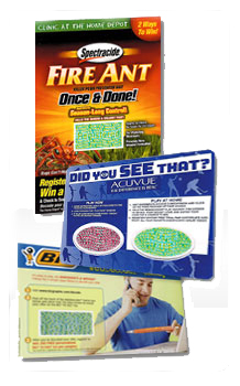 This interactive promotion is used to drive online traffic and improve awareness of new products or features. The game piece or decoder uses a peel-away clear film with a hidden text area that can only be revealed on a special blue screen displayed on your website.