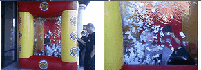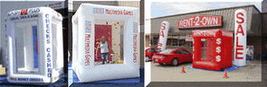 Drive excitement and traffic to your business... great for malls, sporting events, rodeos, trade shows, conventions, art festivals, auto races and even in front of your store... How does it work?... contestant enters a door in back of inflatable... cash, coupons, gift certificates, lotto tickets or other on bottom of cash machine... the blower starts to move around the cash or whatever on the floor... the contestant has 20 to 30 seconds to grab whatever he or she can grab... Portable, reusable, easy to setup, very durable, comes with guarantee. Complete standard package $2995. with package being totally customized even with your logo, company colors and marketing message. Call toll free for more information and pricing 1.866.666.1993